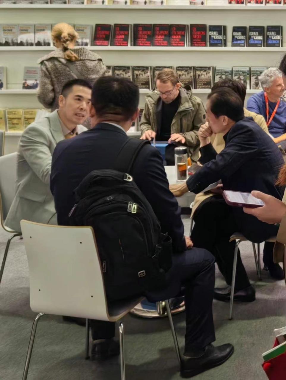 中国嘉宾在2024法兰克福国际书展现场与欧洲出版公司嘉宾洽谈合作项目之一